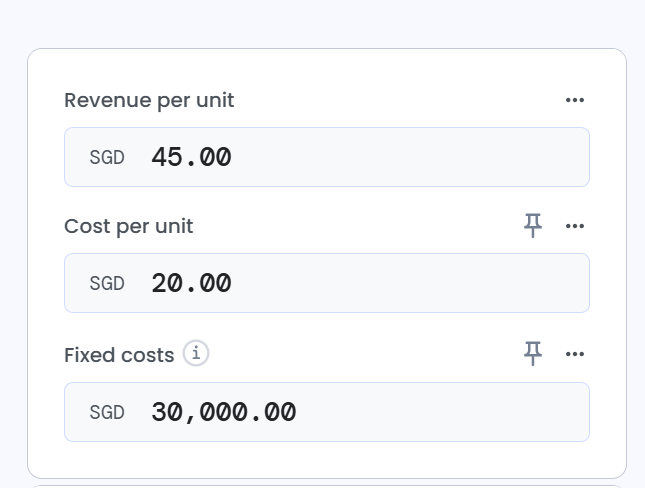 XYZ Enterprises manufactures tires with total fixed costs of SGD $30,000 and variable costs of SGD 20. The company set the sale price per unit for these tires at SGD $45.