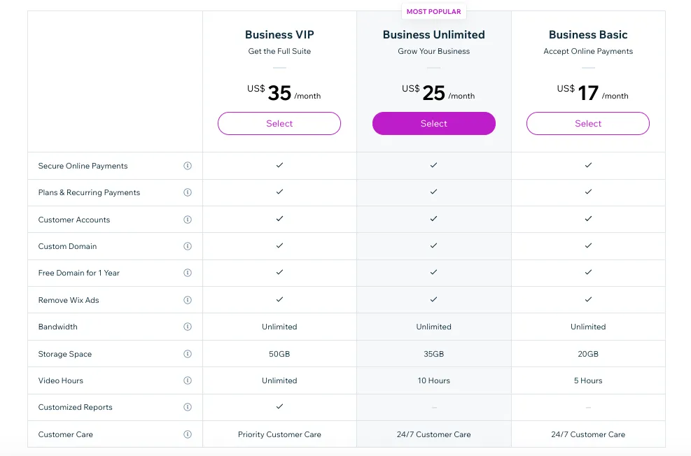 One of the top reasons why beginners choose Wix eCommerce is for its more competitive pricing plans. According to the needs of your e-commerce business, pricing plans range from US$17 a month for the Business Basic plan, US$26 a month for the Business Unlimited Plan to US$35 a month for the Business VIP plan.