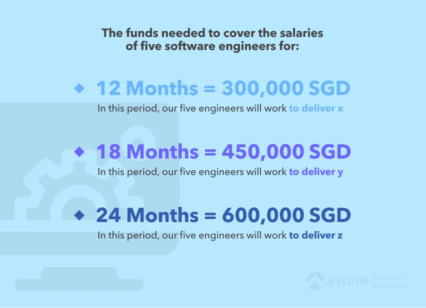 If you’re planning to hire five engineers for twenty-four months, you’ll need an investment of 5,000 SGD x 5 x 24 months, which equates to 600,000 SGD.
