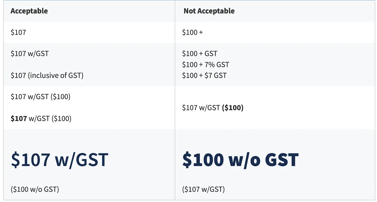 If you want to display the GST-exclusive price as well, you can do so, but the GST-inclusive pricing must be displayed at least as prominently as the non-GST pricing. It is not enough to provide a disclaimer that the prices shown are exclusive of GST.