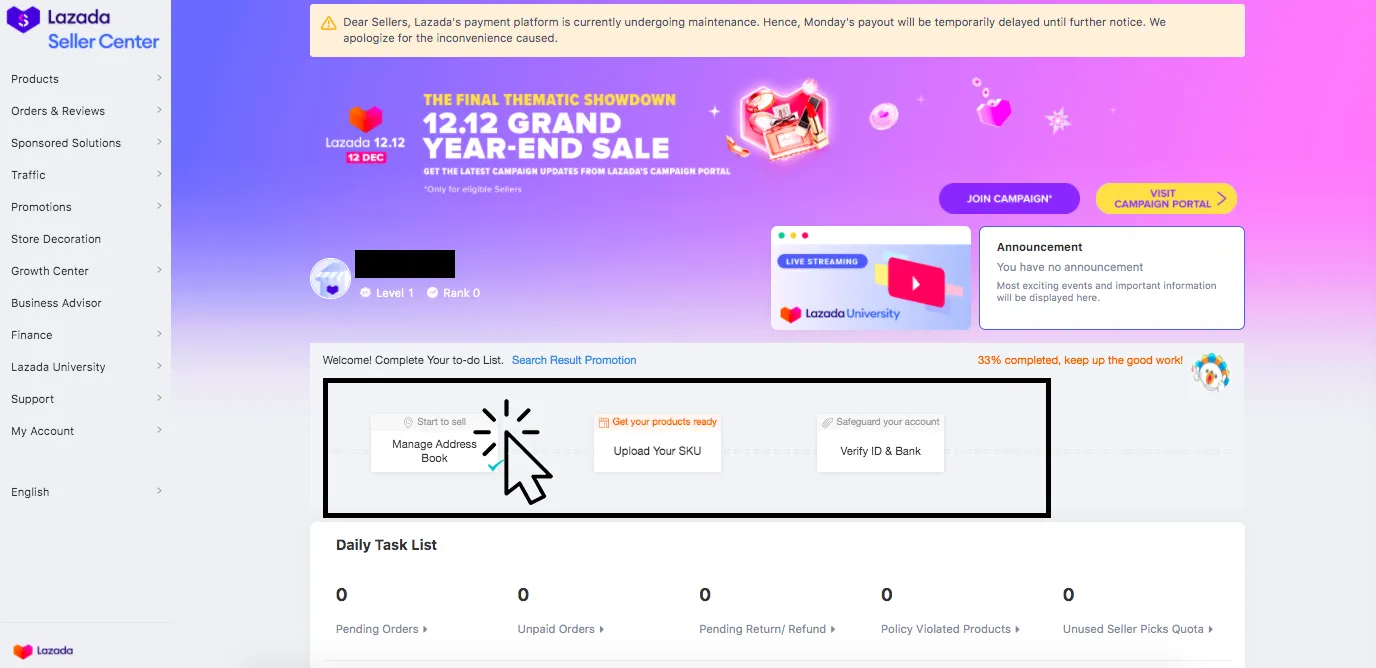 Next, you’ll be directed to the seller centre’s main page. You’ll be prompted to complete a to-do list. Key in your address and shipping details, then click ‘Upload Your SKU’ to begin uploading your products.