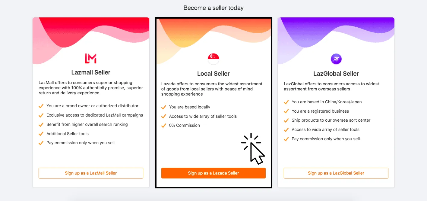 Select ‘Local Seller’ to list your products for free. But before you sign up, check that your products are not on the Lazada seller’s prohibited list. Some of the products that you cannot sell on Lazada Singapore are:
