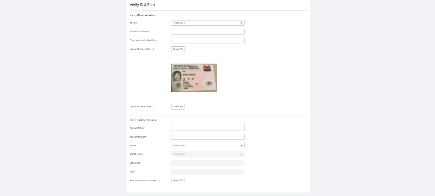 To proceed with your sign-up, you will need to upload certain documents and get them verified. As an individual seller, you will need to upload a front and back copy of your NRIC. Corporate sellers need to upload ACRA data.