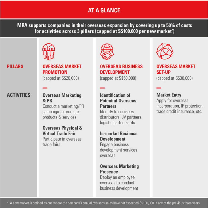 The focus of the Market Readiness Assistance (MRA) grant2 is to help Singapore SMEs expand and gain access to overseas opportunities, from market setup and identification of overseas partners to promotions.