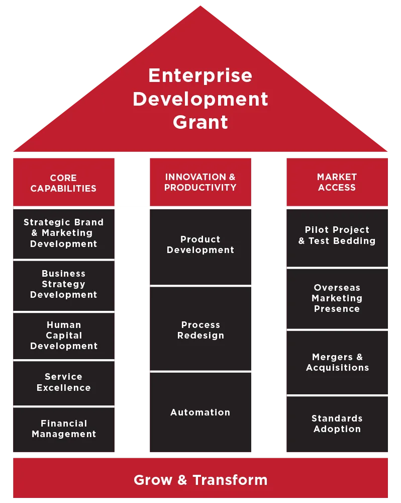 The Enterprise Development Grant helps Singapore companies grow and transform their businesses. It provides funding for projects that improve operations, support innovation, and help businesses expand overseas.