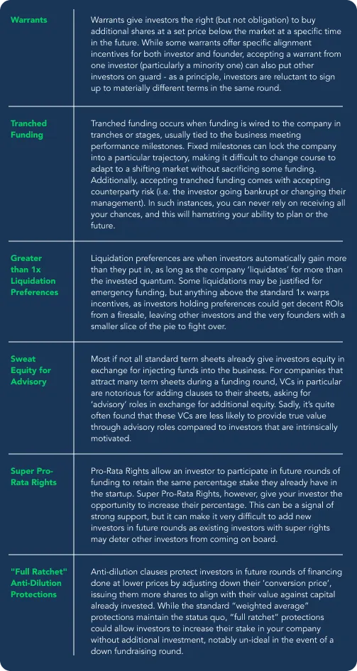 Beyond valuation, certain clauses deserve extra scrutiny. Restrictions on future funding, aggressive liquidation preferences, excessive control rights, or unusual veto powers can create long-term friction. These terms are difficult to unwind once agreed upon. Here is a quick list of some terms to be wary of and why:
