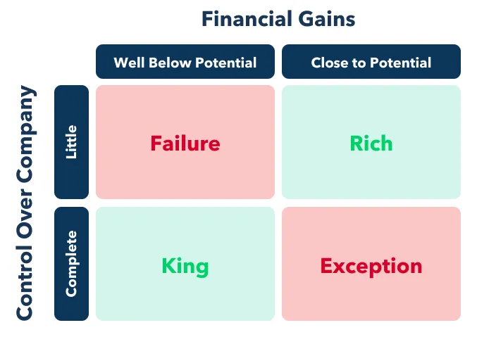 Founders must ask how much equity they are willing to part with to secure investment. Do they want to maintain control over all business decisions or cede that control to someone potentially more qualified? Is leading worth more than securing financial gain, or is it better to concede some control in exchange for financial flexibility? Founders’ choices are straightforward: Do they want to be rich or king? Few have been both.