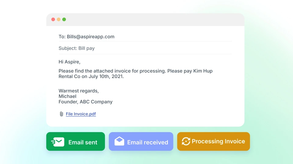 It takes an average of 120 clicks to pay an invoice. Aspire makes it as simple as sending an email. AI automatically inputs data directly from your invoices, eliminating manual entry and reducing errors.