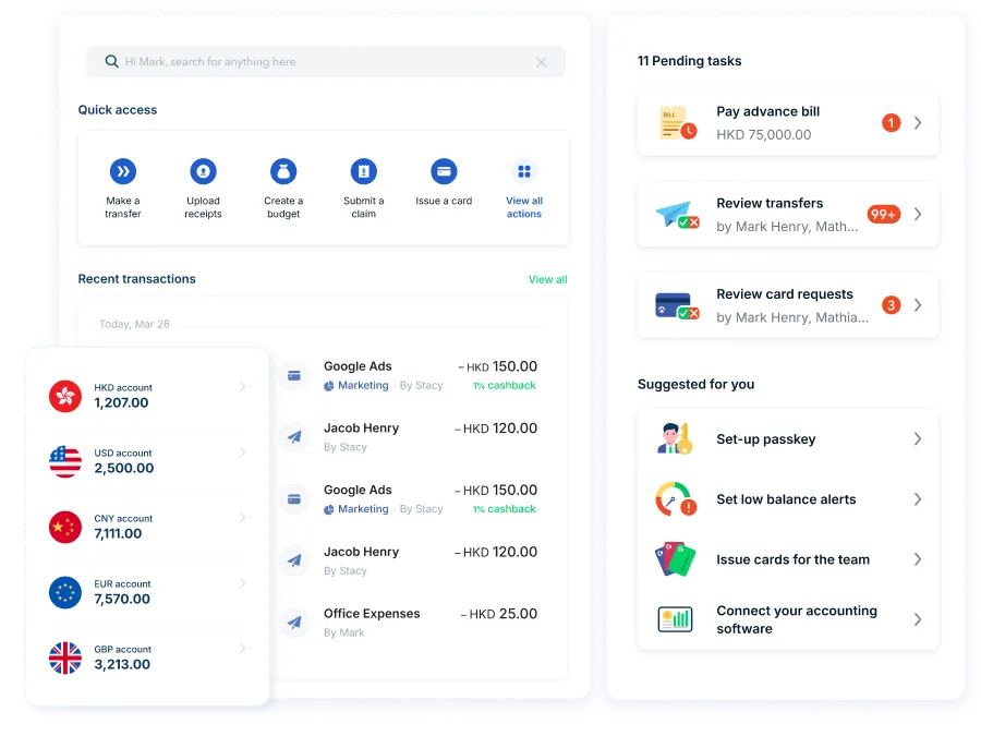 此外,你可使用公司卡碌卡埋單,在市場營銷、SaaS 訂閱等指定開支上最高賺取 1% 現金回贈。這些回贈會每月自動存入你的賬戶,真正將您的營運成本轉化為持續回報。結合開支管理工具,即時追蹤報銷與收據,從此告別雜亂單據和對賬。立即免費開立賬戶,體驗比傳統銀行更靈活、更智能的理財方案,加速你的業務成長!