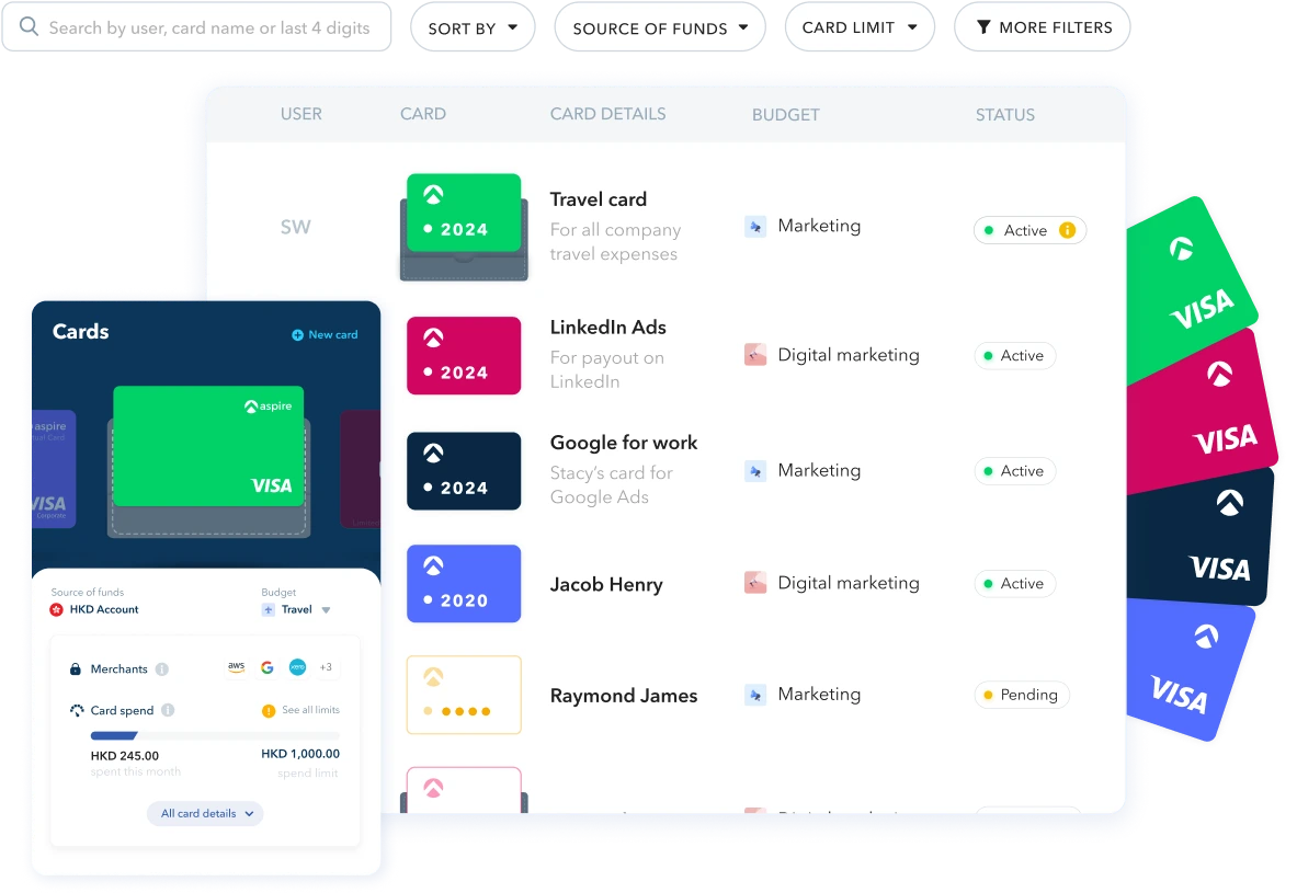 • 透過金融科技支付平台:如 Visa 或 Mastercard 的合作平台(例如 Aspire)。這類平台通常提供比傳統銀行更細緻的支出控管功能。企業只需在線完成簡單註冊公司戶口,即可針對不同專案、預算設定或即時監控需求,極速發放多張專屬虛擬卡。