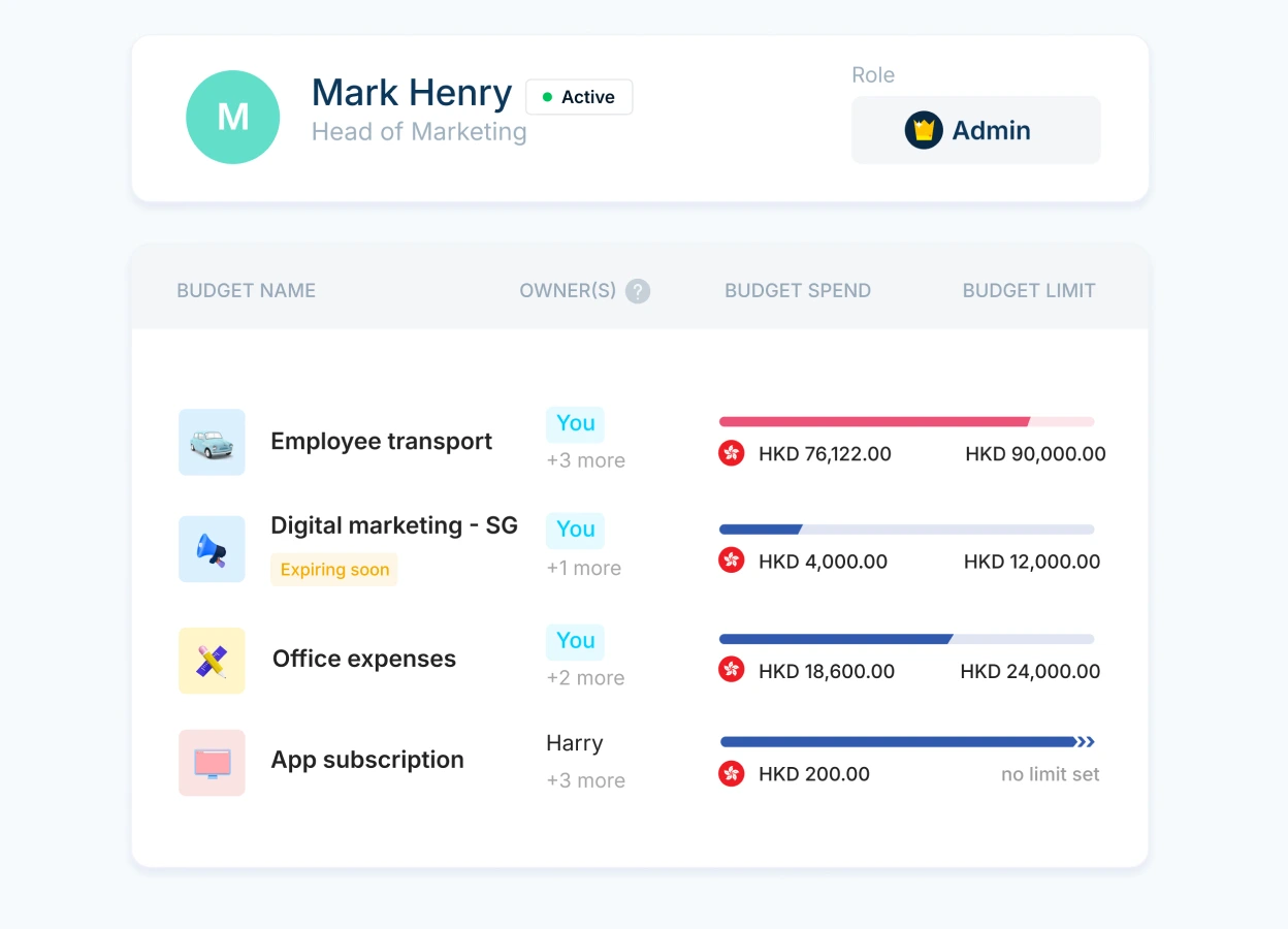 HSBC 缺乏內置的開支管理工具;Aspire 則將公司卡與開支管理系統深度整合,助您實時監控團隊簽賬,確保每一筆支出均嚴格符合公司政策,有效防止超支。