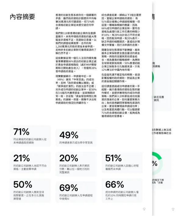 這份調查透過成功申請者的第一手經驗,揭示香港政府資助生態的運作模式,並提供實用性的成功申請策略。我們深入分析那些成功克服資訊落差的企業,如何重塑業務方向;為何善用顧問等策略性資源的企業,更容易實現高申請成功率;以及有甚麼具體行動,可以驅使那71%的合資格初創企業,能夠成為獲得資助 。