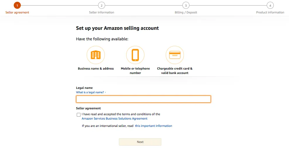 Begin by creating your account on Amazon’s Seller Central. Fill in the necessary details. Note that this multi-step process is lengthy and will take at least 20 minutes.