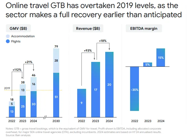 The online travel sector has not only recovered but surpassed pre-pandemic levels earlier than anticipated, with gross travel bookings (GTB) reaching $46 billion in 2024. The aviation sector has been a particularly strong performer, exceeding pre-pandemic levels with significant growth in airfares, especially for flights originating from Singapore. The accommodation segment has also seen notable evolution, with a clear shift in consumer preferences towards luxury travel experiences, while vacation rental GTB shows some deceleration.