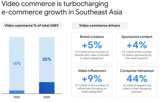 E-commerce continues to be the powerhouse of Southeast Asia's digital economy, with projected values reaching $159 billion in 2024, up from $138 billion in 2023. A particularly exciting development is the rise of video commerce, which now accounts for 20% of e-commerce value.